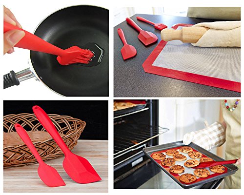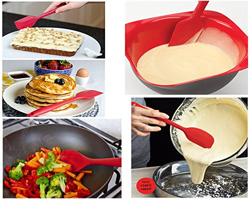 ?Made of 100% food grade silicone material. FDA approved BPA free. ?Unique one piece design makes cleaning so much easier and there is no fear of bacteria building up or particles stuck-up. ?Throw them in the sink or dishwasher and they are cleaned in seconds. ?The metal rod under the silicone handle supports a strong and flexible grip. These spatulas, spoon and basting brush are built to last!!! ?Safe to use in oven, microwave, frying pan, cooking pot and grill for temperature up to 480 degrees fahrenheit.