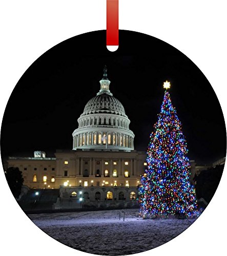 United States Capitol- Washington D.C.-on Christmas Eve-Flat Round-Shaped Aluminum Christmas Ornament with a Red Satin Ribbon/Holiday Hanging Tree Ornament/Double-Sided Decoration/Great Unisex Holiday Gift!-Made in the USA!