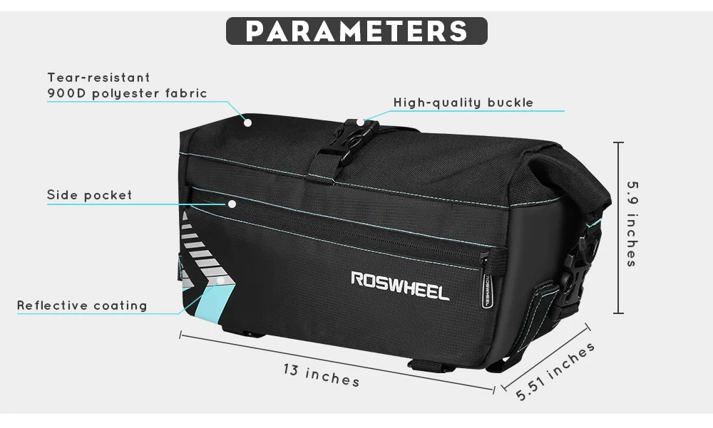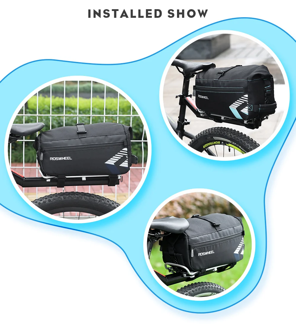 FAQ: Q: Trunk bags have some attached straps, so can they be attached to the rack? A: Yes, there are two nylon hook straps on the front and two on the bottom, which helps the bag fixed on the bike rear firmly.