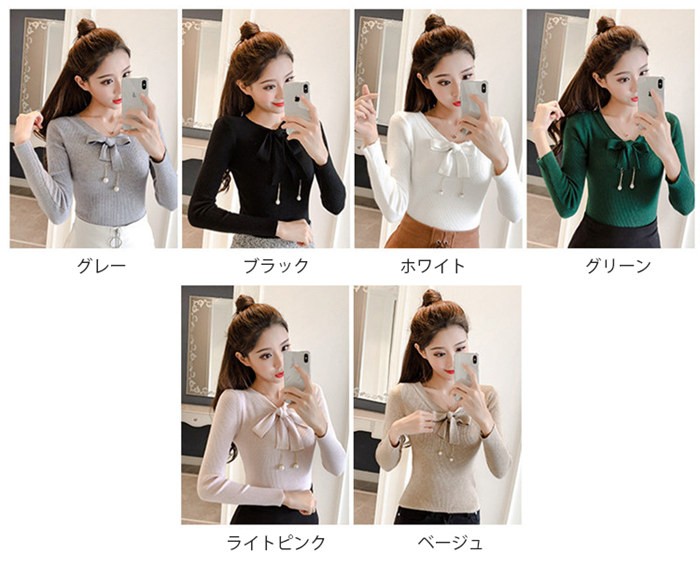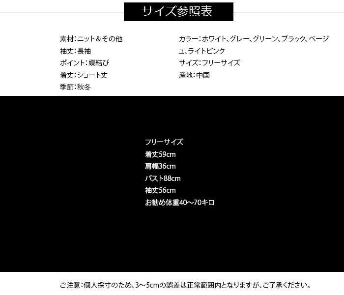 セーター レディース ニットセーター ニットトップス 薄て無地 トップス カジュアル ファション 着痩せ 2018秋冬新作 ニットセーター レディース 長袖 トップス商品詳細素材:ニット&その他袖丈:長袖ポイント:蝶結び着丈:ショート丈季節:秋冬カラー:ホワイト、グレー、グリーン、ブラック、ベージュ、ライトピンクサイズ:フリーサイズ産地:中国サイズ参照表フリーサイズ着丈59cm肩幅36cmバスト88cm袖丈56cmお勧め体重40~70キロご注意:個人採寸のため、3~5cmの誤差は正常範囲内となりますが、ご了承ください。セーター レディース ニットセーター ニットトップス 薄て無地 トップス カジュアル ファション 着痩せ 2018秋冬新作 ニットセーター レディース 長袖 トップス