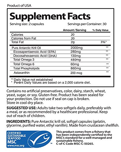 Studio : Vital Choice Seafood Publisher : Vital Choice Seafood Binding : Health and Beauty Product Description Includes 410mg of EPA DHA. Many public health authorities worldwide recommend 250-500mg of of EPA DHA per day. Whole, unrefined Wild Antarctic Krill Oil provides essential omega-3s and unrivaled levels of antioxidants within a unique natural matrix. 0