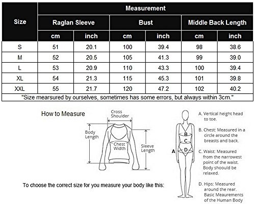 US Size XXL(20) ----Raglan Sleeve---55cm/21.7";Bust---120cm/47.2";Middle Back Length---102cm/40.2"