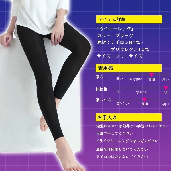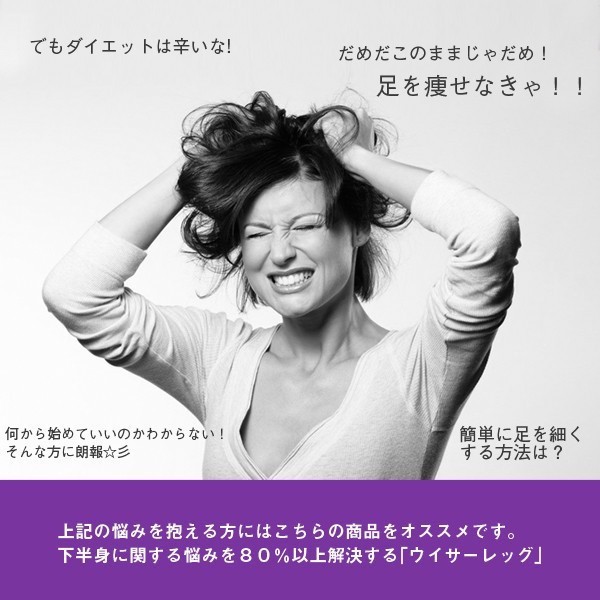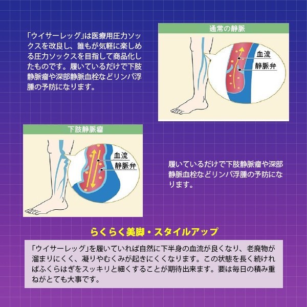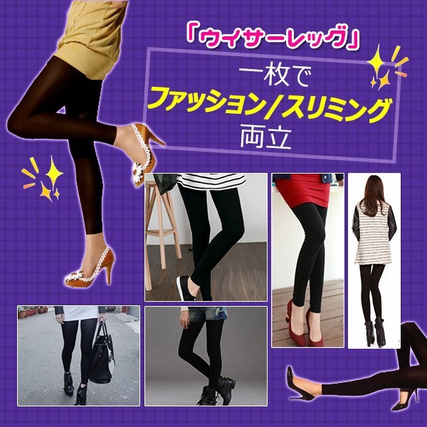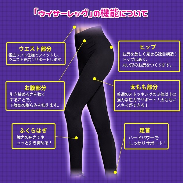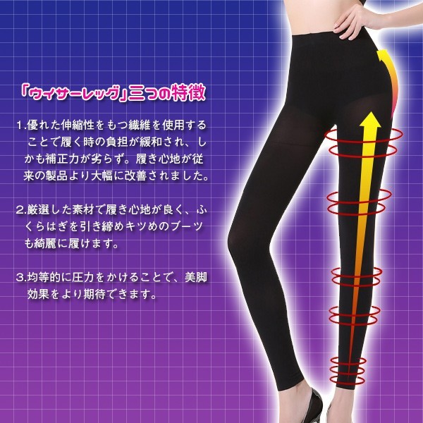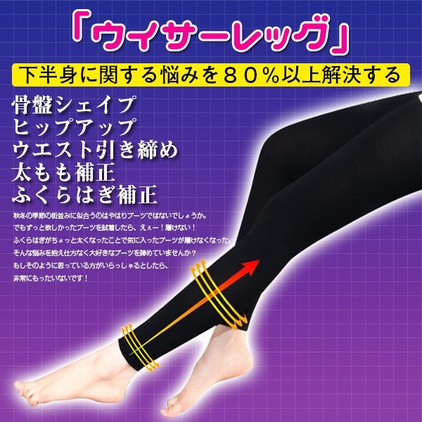 「ウイサーレッグ」には脚痩せ効果だけではなく30hPa強の加圧効果により、足首・ふくらはぎの下から上に向かうリンパの流れを整える効果が期待できます。強力な着圧で効率良く脂肪燃焼し、下半身を細くしてもらうことはもちろん、慢性的なむくみやセルライトにも効果的。下半身が太くなる原因は瞬発力を必用とするスポーツを長年やっていることや立ち仕事、デスクワーク、運動をしない、猫背や反り腰といった不良姿勢をとるなどを指摘されます。「ウイサーレッグ」を履いていれば上記の全てを改善することが可能です。さぁー「ウイサーレッグ」で美脚への第一歩を踏み出そう!!商品名:ウイサーレッグ 材質:ナイロン90% ポリウレタン10%サイズ:フリーサイズ生産地:中国