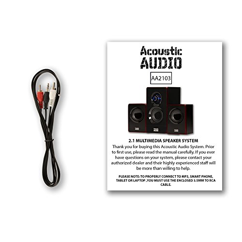 -. Feature : Acoustic Audio AA2103 Bluetooth 2.1 speaker system, 200 watts system power, frequency response is 50Hz-20 kHz, built in Bluetooth receiver, integrated amplifier, enhanced bass boost design / Front panel volume control, rear sub bass control knob, top USB and SD/MMC inputs, plug and play connections, full function remote, computerized enclosure design / Magnetically shielded speakers, subwoofer speaker is (H x W x D) 8.5" x 4.75" x 7", ported for fuller bass, the 2 full range satellite speakers are (H x W x D) 5.125" x 3.625" x 3.125" each / Satellite speakers have 6' single RCA cables, 3.5mm to RCA cable and user manual included, 110V required power supply / Use for home entertainment, laptop or PC, DVD, gaming, any devices with a 3.5mm headphone output or RCA audio output, this listing and P.R.Ice is for 1 complete speaker system