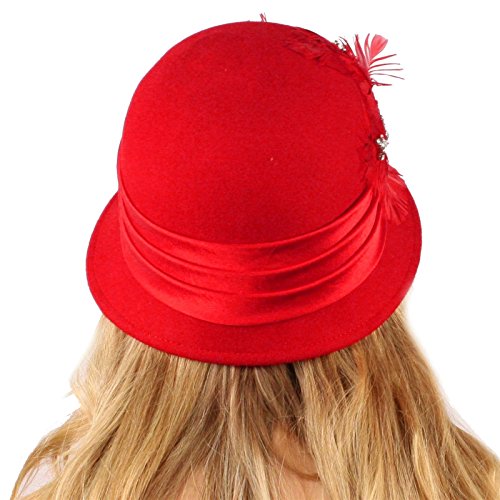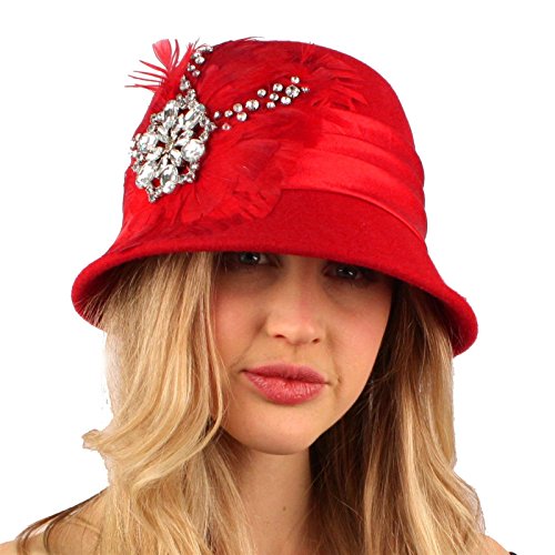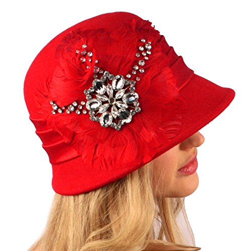 New 1920s Flapper 100% Soft Felt Wool Winter Classic Cloche ?Bucket Bell Shape Bowler Satin hatband with sophisticated tone on tone feathers with exquisite rhinestones along the brim Millinery Church Cap ?Hat. ?Truly an elegant silhouette. ?(Adjustable interior draw string) New 100% Soft Wool Winter Classic Cloche ?Vintage, Flapper, Bucket Bell Shape, tone on tone satin Hatband with adorned with beautiful rhinestone jewels. No lining with adjustable draw string interior sweatband. Great quality. ? Great for chilly weather or a glamorous affair. ?Comfortable fit. ?Dress ?it up, dress it down. ?Great for vacations, ?outdoor activities or just everyday wear. The ?cloche hat is a fitted, bell-shaped hat that was popular during the ?1920s. (Cloche is the French word for bell.) Cloche hats are an ?essential adornment to compliment any woman's outfit from the simplest ?to the sleekest. It doesn't matter where you're headed; a cloche hat is ?an item that must be in every woman's closet - spring, summer, winter or ?fall. 0 |
