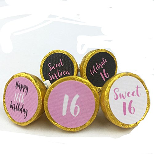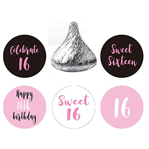 Sweet 16 – Pink 16th Birthday Party Favor Stickers, Round Candy Labels Fit Hershey’s Kisses, 200 Count