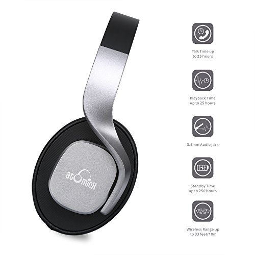 -. Feature : UPGRADE YOUR SMARTPHONE LISTENING EXPERIENCE: Spend a little to upgrade your smart device listening experience a lot - supporting 25 hours wireless playback or talk time, perfect choice as a commuter headphones, ultra lightweight and stylish design weighing only 6.4oz / CONNECTS WIRELESSLY HOUR UPON HOUR: A built-in rechargeable 500mAh battery holds a ton of juice to keep you listening to your favorite music, radio and videos from multiple smart devices via Bluetooth without worrying when your next recharge is. / TAKE WITH YOU ON THE GO: Featuring wide wall foam ear pads with soft touch protein leather for a supremely comfortable on-ear fit - padded and adjustable contoured headband, pivoting earcups that angle flat against your head, balanced weight distribution and foldable for travel / WIRELESS AND WIRED CONNECTION OPTIONS: Reliable Bluetooth 4.0 connects to your Bluetooth enabled devices in seconds with 33ft effective range, play wired via 3.5mm AUX port with cable (included) - built-in mic for taking calls - simple on-board controls / SATISFACTION WARRANTY: 30 days money back guarantee - 1 year manufacturers warranty. Compatible with Apple and Android devices, join the thousands of customers already delighted by our wireless headphones