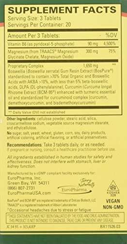 -. Binding : Health and Beauty -. Brand : Terry Naturally -. EAN : 0367703115265 -. Feature : BCM-95 Curcumin is better absorbed than plain curcumin. It provides a P.R.Imary response to occasional headaches.† / Magnesium supports healthy neurotransmitter activity in the brain, and clinical studies have shown it relieves occasional headaches.† The amino acid chelate included in this supplement is better absorbed for greater benefits. / BosPure Boswellia is clinically studied and uniquely standardized by reducing beta-boswellic acid and providing higher levels of AKBA for greater effectiveness. / DLPA helps support the effects of endorphins and enkephalins-the "feel good" chemicals in your body. / Vitamin B6 as Pyridoxal-5-Phosphate (P-5-P) can be readily used by the body because it is already in the bioactive form. P-5-P is a factor in serotonin production and relaxation. -. IsAdultProduct : 0 -. Label : Terry Naturally -. LegalDisclaimer : non-returnable -. Manufacturer : Terry Naturally -. MPN : 367703115265 -. NumberOfItems : 60 -. PackageQuantity : 1 -. PartNumber : 367703115265 -. ProductGroup : Health and Beauty -. ProductTypeName : HEALTH_PERSONAL_CARE -. Publisher : Terry Naturally -. Size : 60 -. Studio : Terry Naturally -. Title : Terry Naturally Curamin Headache with Clinically Studied BCM95 Curcumin 60 Tabs -. UPC : 367703115265