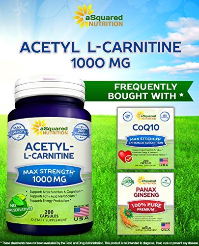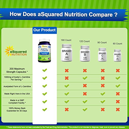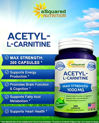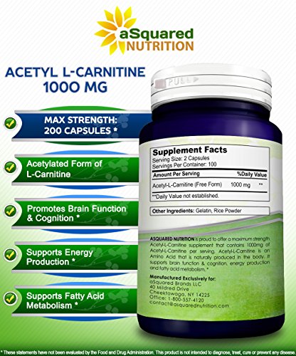 MAXIMUM STRENGTH ACETYL L-CARNITINE: aSquared Nutrition’s Acetyl L-Carnitine formula is packed with 1000mg of pure Acetyl L-Carnitine per serving, with 500mg of Acetyl L-Carnitine per capsule. Our complex contains 200 capsules in each bottle for a full 100-day supply. That’s more than 3 months supply! *