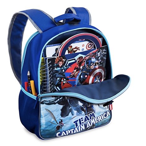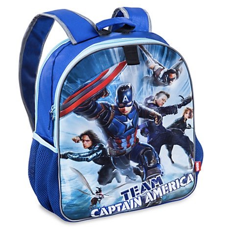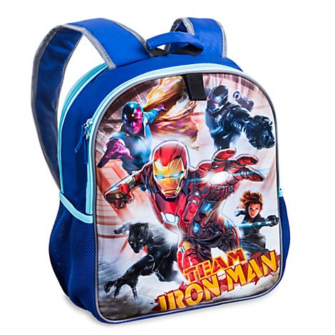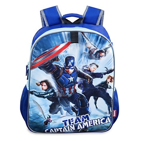 -. Binding : Office Product -. Brand : Disney -. Color : Blue -. Department : Boys -. EAN : 0686751362125 -. Feature : One side features Team Captain America with Winter Soldier, Falcon, Hawkeye, Ant-Man, and Agent 13. The other features Team Iron Man with War Machine, Black Widow, Vision, and Black Panther / Two double-zip compartments with fabric pulls / Front compartment features mesh interior accessory pocket and ID label. / Two mesh exterior side pockets and Top carry handle. Two accessory loops with self-stick fabric fastener. -. IsAdultProduct : 0 -. Label : By Disney -. Manufacturer : By Disney -. PackageQuantity : 1 -. ProductGroup : Toy -. ProductTypeName : TOYS_AND_GAMES -. Publisher : By Disney -. Size : 16'' H x 12'' W x 4 1/2'' D -. Studio : By Disney -. Title : Disney Store Captain America: Civil War Reversible Backpack -. UPC : 686751362125