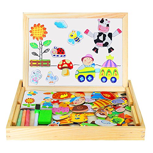Let your child engage their imagination, have fun, learn and discover concepts and train their motor skills. ---Diwenhouse Wooden Magnetic Jigsaw Puzzle 100 Pieces Help Your Kid's Development This educational toy will encourage your child's recognition for patterns, hand-eye coordination and spatial intelligence, as they try to form animals, plants, figures and pictures either inspired by the examples or by what they have in mind. This magnetic puzzle set will also help the kids improve their aesthetic judgment, learning about the match of all shapes and colors and distinguish which element is more appropriate and beautiful. Multifunctional Wooden Magnetic Board Set 1. On the black chalkboard, children can write or draw with the supplied chalk. You can wipe the chalk marks with an eraser inside the box. 2. On the white magnetic side, children can play puzzle game with magnet and draw with the marker pen. A Great Activity While Traveling Portable and easy to store, it is an great traveling game for your little ones, keeping them busy and quiet for a while, having fun passing time while in the car. Note: Remember to remove the protective film from the white board before using it for the first time. What You Will Get: 1×wooden box 1×reversible double sided board 100×magnetic paper pieces 3×chalks 1×marker pen 1×idea book 1×blackboard eraser Friendly Customer Service We are always here to provide prompt and satisfying customer service if you have any idea about the product. 0 |