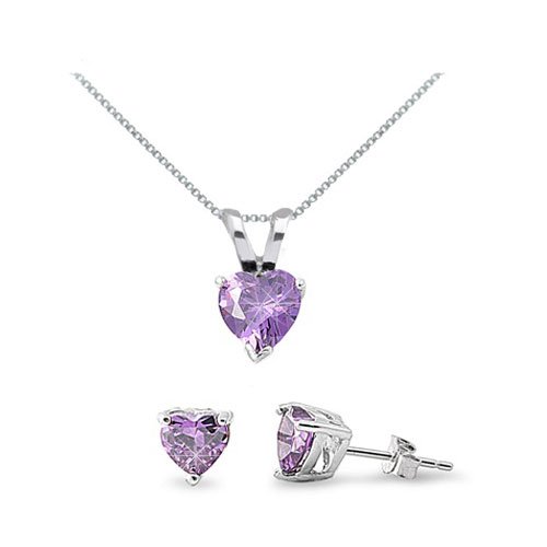 -. Title : Sterling Silver Simulated Amethyst Heart Necklace & Earrings Se t- 16IN to 18IN