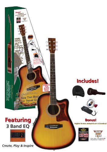 - Feature : Travel Size, Thin Body Cutaway Acoustic Electric Guitar constructed with Spruce Top for Superior Sound. Incorporates Built In 3 Band Equalizer/Built In Guitar Tuner / Package includes Acoustic/Electric Mini Amplifier. Plugs Directly into Your Guitar. Includes Volume & Overdrive/Distortion Controls, Headphone Output Jack and Aux Input Jack for Microphone or Digital Audio Device. / Fully Featured Accessories Pack includes Gig Bag, Adjustable Strap, Strings, Picks, Cleaning Cloth, Bonus Jam Tracks Download & Instructional Video Download