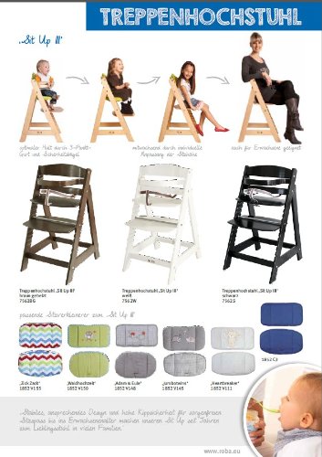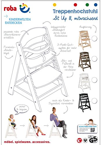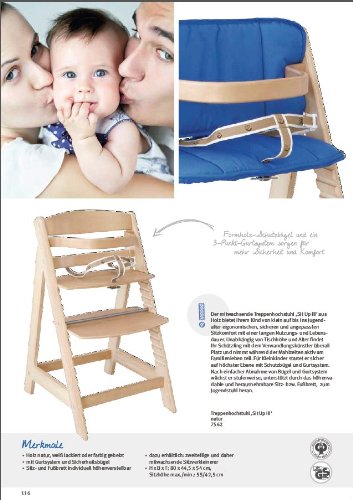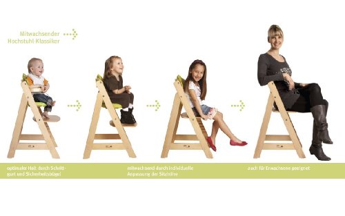 Der mitwachsende Treppenhochstuhl "Sit Up III" aus hochwertigem Schichtholz Multiplex in 'Buche bietet Ihrem Kind von klein auf bis ins Jugendalter ergonomischen, sicheren und angepassten Sitz- komfort mit einer langen Nutzungs- und Lebensdauer. Unabhängig von Tischhöhe und Alter findetIhr Schützling mit dem Verwandlungskünstler überall Platz und nimmt während der Mahlzeiten aktiv am Leben teil. Für Kleinkinder startet er auf höchster Ebene mit Schutzbügel und Sicherheitsgurt. Nach einfacher Abnahme von Bügel und Gurt wächst er stufenweise - unterstützt durch das höhenvariableund herausnehmbare Sitz- bzw. Fußbrett - zum Jugendstuhl heran. Für maximale Sicherheit sorgen der Schutzbügel und eine erhöhte Rückenlehne. Der Rücken Ihres Kindes wird durch die hohe Rückenlehne zusätzlich geschützt. Darüber hinaus bietet der 'Sit Up ' geprüfte Sicherheit: Er ist TÜV- und GS-geprüft und entspricht den Anforderungen der aktuellen Hochstuhl-Norm DIN EN 14988: 2006. weitere Details: mit Schutzbügel und Sicherheitsgurt zweigeteilte Rückenlehne aus Formholz Sitz- und Fußbrett in der Höhe variabel verstellbar separat erhältlich: der zweiteilige Sitz und mitwachsende Sitzverkleinerer in vier Farben erhältlich Material Schichtholz, massiv (Buche gebeizt) oder farbig lackiert Rückenlehne aus Formholz Abmessungen: Gesamthöhe 80 cm Maximale Sitzhöhe 55 cm Minimale Sitzhöhe 42 cm Breite 44,5 cm Tiefe 54 cm Sicherheit: TÜV-geprüfte Sicherheit nach DIN EN 14988: 2006.Feature
