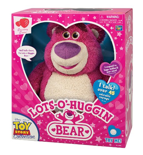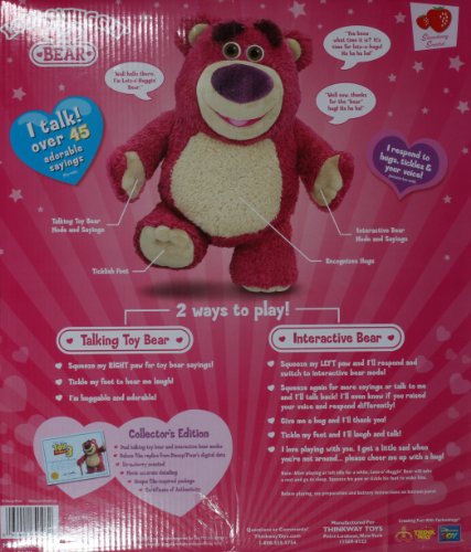 -. Binding : Toy -. Brand : Disney Pixar -. EAN : 5054186394274 -. Feature : Definitive Collectors Edition Lotso Hin Bear Unique facial expressions, laughs if you tickle feet / Soft plush body with velcro hands for easy hing, poseable arms / legs Eyes close when laid down / Press left hand to hear Toy Story phrases, right hand to hear Come Alive phrases as in movie / Responds accordingly to tone / volume of your voice, knows if you shout or speak softly / It is 14" tall -. IsAdultProduct : 0 -. Label : Thinkway -. Manufacturer : Thinkway -. Model : 64026 -. MPN : 64026 -. PackageQuantity : 1 -. PartNumber : 64026 -. ProductGroup : Toy -. ProductTypeName : TOYS_AND_GAMES -. Publisher : Thinkway -. Studio : Thinkway -. Title : Toy Story Collectors Edition Lotso Hin Interactive Bear -. UPC : 784369510508