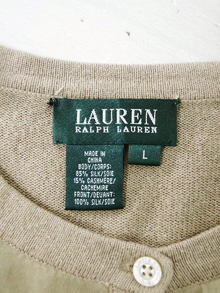 Ladies ブランドLAUREN RalphLauren ローレン ラルフローレン カラーベージュ メール便不可 コンディション★★★ モデル- 素材ニット・シルク85%・カシミヤ15%/柄素材・シルク100% 表記サイズL スタッフコメント左袖手首付近にシミあり。 実寸サイズ 着丈 55.5 cm 身幅 52 cm 肩幅 40 cm 袖丈 61 cm ※ウエスト・ヒップ以外は平置き採寸
