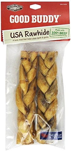 -. Binding : Health and Beauty -. Brand : Good Buddy -. EAN : 0794168608375 -. Feature : Made in the USA from grass-fed beef / A delicious way to help keep your dog's teeth and gums clean / Rawhide is also a great solution aggressive chewers, or puppies that are inclined to chew on things -. IsAdultProduct : 0 -. Label : Good Buddy -. Manufacturer : Good Buddy -. MPN : 7062 -. PackageQuantity : 1 -. PartNumber : 7062 -. ProductGroup : Pet Products -. ProductTypeName : HEALTH_PERSONAL_CARE -. Publisher : Good Buddy -. Studio : Good Buddy -. Title : Good Buddy USA Rawhide Braided Sticks for Dogs, 7 to 8-Inch -. UPC : 794168608375