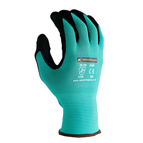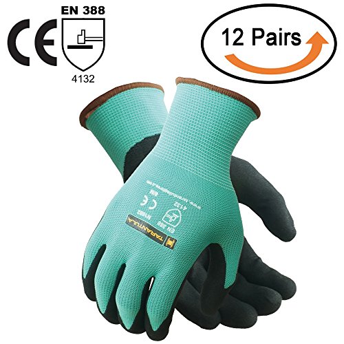 TARANTULA Nitrile Coated Safety Work Gloves for General Purposes, Lightweight Work Gloves, 13 Gauge Mint Green Polyester Shell, Black Sandy Nitrile on Palm and Fingers, 12 Pair Per Pack