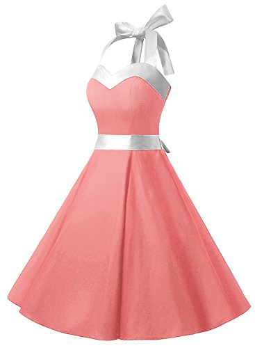With its elegant halter neckline, form-fitting bodice, empire waist, size zipper up closure, lace up elastic back, and knee length skirt, this elegant knee length retro audery dress is worthy of celebration!