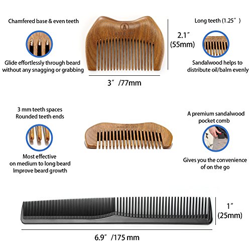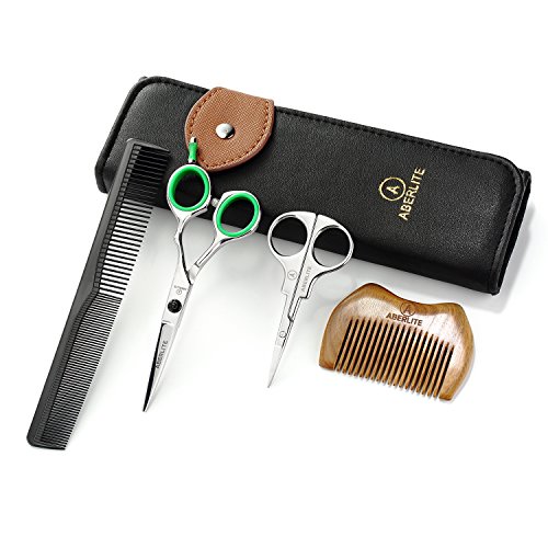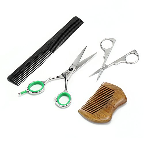 - FIVE-PIECE GROOMING KIT: Includes 4.5" professional beard/hair scissors, 3.7" travel size beard/mustache scissors, EDC green sandalwood comb, master barber comb, and high quality PU leather. Kit allows precise, smooth, professional style trimming at home or on the go. Perfect gift for men - or get one for yourself!