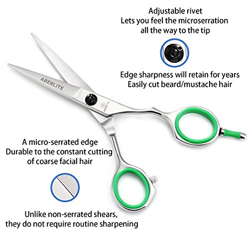 - 4.5" PROFESSIONAL MICRO-SERRATED BEARD/HAIR SCISSORS: These scissors are precision 4.5" scissors for facial use, with one micro-serrated cutting edge that can endure exposure to tough and wiry beard hair without wearing out quickly. Unlike non-serrated shears, they do not require routine sharpening. The serrated edge will grip the hairs to provide a smooth, even cut. Also great for hair cutting. No more hair pulling, stay sharp for a long time!