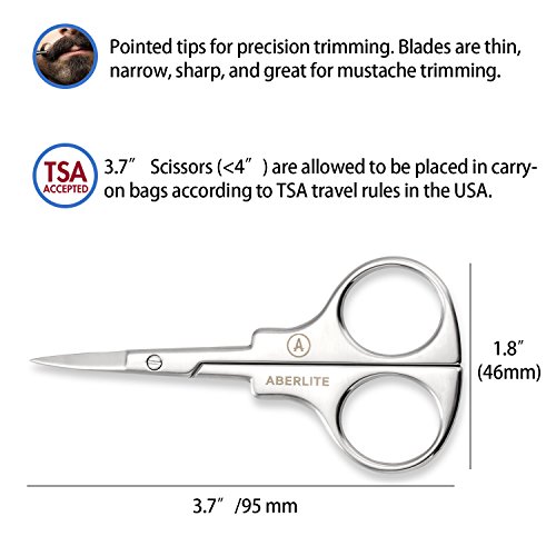 - 3.7" TRAVEL-SIZE BEARD/MUSTACHE SCISSORS: The beard/mustache scissors are ergonomically designed and made of rust-free stainless steel. Their small size (3.7" x 1.8") allows them to be placed in a carry-on bag (scissors less than 4") according to TSA travel rules in the USA. The tips are pointed and the blades are thin and super sharp, providing the lightest and most precise feel during scissoring. Precision Trimming & Perfect for Traveling!