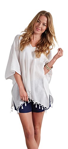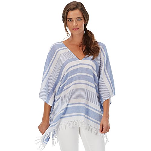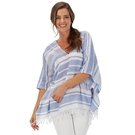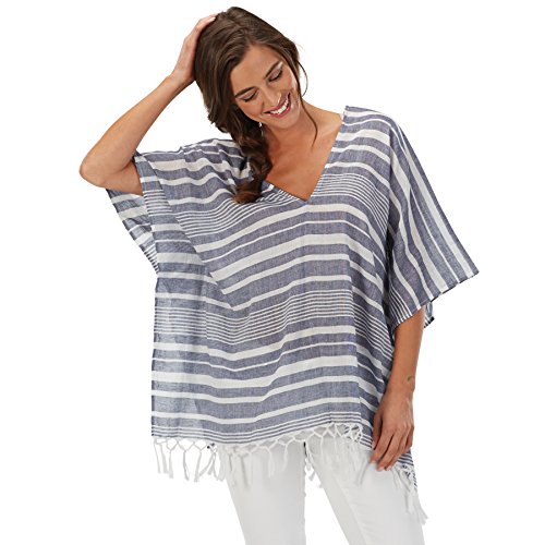 Mud Pei - Women's Melanie Poncho. choose from 3 colors: chambray stripe, navy stripe and solid white. Cotton yarn-dyed poncho features tasseled hem trim. Measures approximately 26 1/2" from shoulder to hem. One size fits most.Feature
