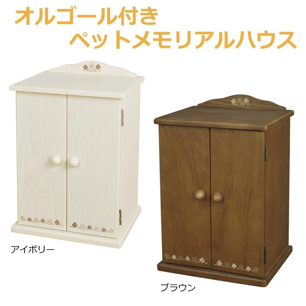 レーザー彫りのクローバーがさりげなく入った観音扉タイプのオルゴール付きペット用仏壇です。中蓋付きの引き出しはそのまま仏具が置けるテーブルになります。 |