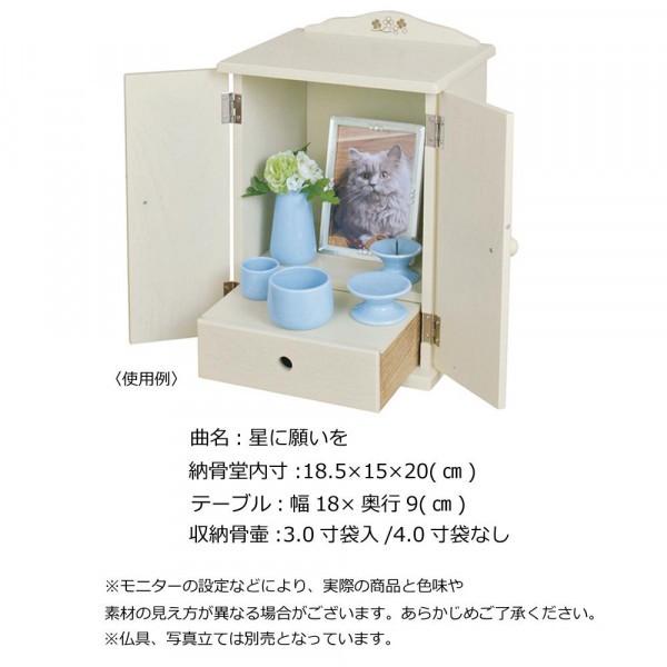 | 仕様 | 曲名:星に願いを 納骨堂内寸:18.5×15×20cm テーブル:幅18×奥行9cm 収納骨壷:3.0寸袋入、4.0寸袋なし 完成品 |