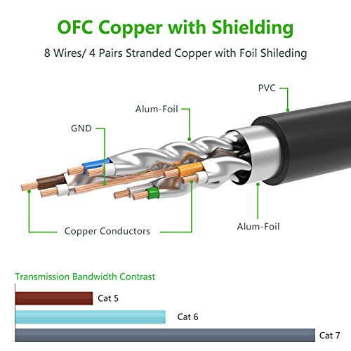 SHIELDED FROM INTERFERENCE: Made of 4 shielded twisted pair (STP) of copper wires with two RJ45 connectors on each end. Compared to the Cat 6 network Ethernet cable, the additional shielding and improved quality in twisting of the wires provides better protection from crosstalk, noise, and interference that can degrade the signal quality