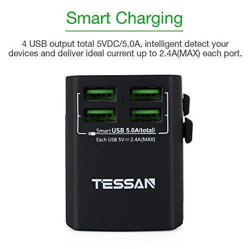 - ✔.TESSAN Travel charger with 4USB,Certified by FCC,CE,ICE and ROHS,High-quality fire-resistant and high temprature-resistant ABS material makes it fireproof of up to 750℃ and our worry-free 18-month warranty and friendly customer service