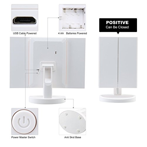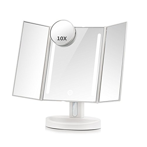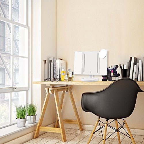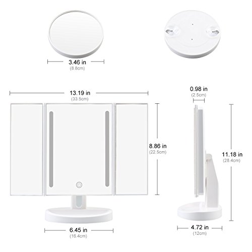 - CONFORM TO YOUR NEEDS – With auto shut-off, touch sensors and 180 Degree free rotation mechanism, this trifold travel mirror conforms to all your needs. Its 10x magnifying round mirror is removable. Great for trips, vacations, and your purse.