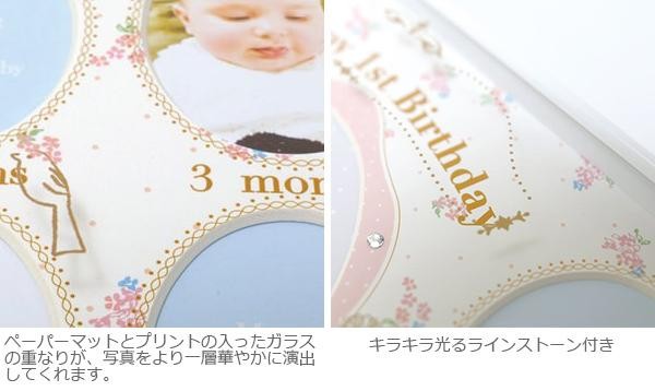| 生まれてから毎月1枚ずつ写真を収めて完成させる、12ヶ月フォトフレーム。キラキラ光るラインストーンが付いたペーパーマットとプリントの入ったガラスの重なりが、中に入れる写真をよりいっそう華やかに見せてくれます。 |