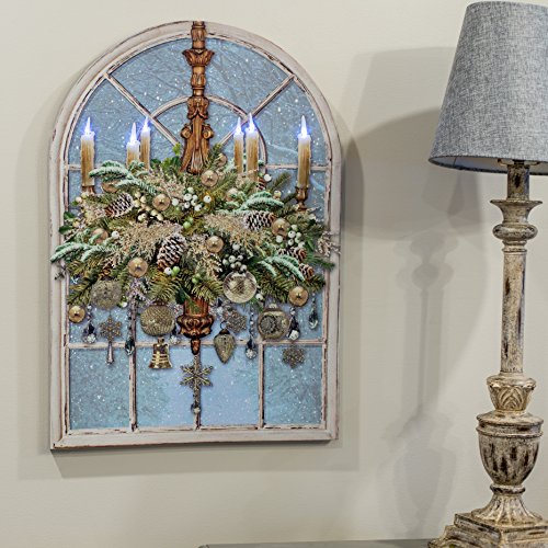 Beautiful wintery Christmas chandelier in a window accented by bells, evergreen foliage, and pinecones; candle flames emit a soft glow when illuminated