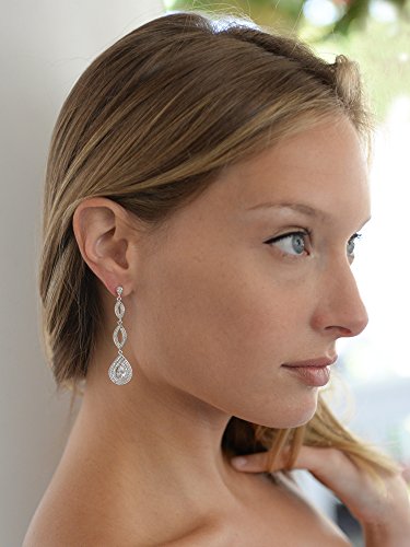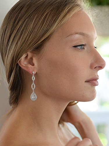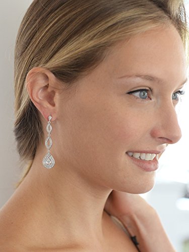 Mariell's lavish Cubic Zirconia earrings for brides, weddings, proms, pageants, homecomings or bridesmaids feature breathtaking inlaid micro pave CZ's. These slender Silver Rhodium earrings have to be seen in person to fully appreciate their elegant understated brilliance and sparkle. Adorn your special occasion dress with these best selling dangle earrings for a dramatic finishing touch. With their unique and intricate pear-shaped silhouette, all eyes will be on you as you make your grand entrance in these breathtaking CZ. Vintage heirloom styling seamlessly blends with a slender modern design for the perfect jewelry for any occasion. With a lifetime quality guarantee, we promise you'll love these top-selling beauties for years to come!Feature