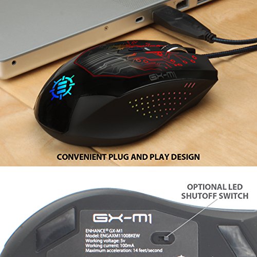 ENHANCE GX-M1 Precision Gaming Mouse. Made for Gamers - The ENHANCE GX-M1 was built with the PC gamer in mind with 6 easy-to-reach buttons designed for your macros and hotkeys and the ability to change the DPI setting in seconds! The DPI switches from 1200 , 2400 and 3500 DPI to give the perfect range of sensitivity. In addition , the premium optical sensor adds pinpoint precision and control so your cursor never slips or skips. Plug-n-Play design means no driver installation; simply plug into a USB port and go! Comfortable Design - Made with a tough braided cable and reinforced USB 2.0 plug , the GX-M1 features an ergonomically scooped design with soft , rubberized grip that's easy and comfortable to use. Light Show or Low Profile - You Decide - For those that like a little flash in their setup , the GX-M1 sports three color-blending LEDs that shift through a kaleidoscope of 7 different hues , giving your mouse a glow your friends will envy. If you don't want any visual distractions , the mouse also has a simple LED shutoff switch on the bottom. WORKS WITH: ARK: Survival Evolved / Assassin's Creed Syndicate / Battlefield 4 / Borderlands / Call of Duty: Black Ops III / Civilization V / Counter-Strike: Global Offensive / Dark Souls III / Diablo III: Reaper of Souls / Divinity: Original Sin / Doom / Dota 2 / Dragon Age: Inquisition / Dying Light / The Elder Scrolls V: Skyrim / Elite: Dangerous / Fallout 4 / Final Fantasy XIV: A Realm Reborn / Firewatch / Grand Theft Auto V / League of Legends / H1Z1 / Just Cause 3 / Metal Gear Solid V: The Phantom Pain / Minecraft / FIFA 16 / Football Manager 2016 / Starcraft 2: Legacy of the Void / TitanFall / Team Fortress 2 / Tom Clancy's The Division / Total War: Atllia / Warframe / The Witcher 3: Wild Hunt / World of Warcraft: Warlords of Draenor and more PC games!