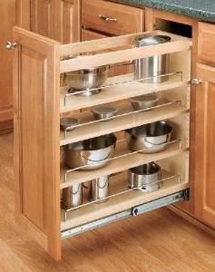 Studio : Rev-A-Shelf Publisher : Rev-A-Shelf Product Description Beautifully finished pull-out base organizer with a clear coating to preserve the woods character and allow an acceptable match to nearly any cabinets. Includes: One 4-Tier Pull-Out with Adjustable Shelves and Chrome Railing, Full Extension Tri-Slides for stability, Door Mount Design, Rub Bushings for Face Frames and Unique Stabilizer Bar Dimensions: 6-1/2" wide x 25-1/2" high x 22-1/2" deep 0