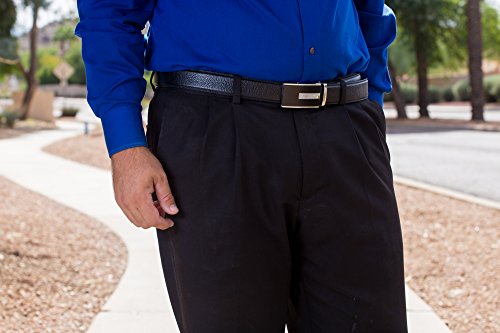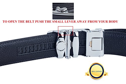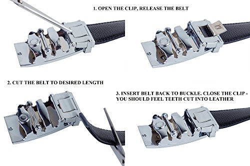 -. Feature : GIFT BOX - comes in a nice black gift box, with 1 extra buckle for free / 2 ELEGANT BUCKLES - easy to open buckle (with knife, spoon, etc.) allows you to change your buckle in few seconds / 3 SIZES - belt length 47.2" (120cm) for waist sizes 31"-37", belt length 53.2" (135cm) for waist sizes 37"-43", belt length 59" (150 cm) for waist size 44"-50". You can even easily cut the belt to your desired size / EASY USE - to tighten the belt, slide the belt into the buckle and pull the belt through, the buckle automatically locks the belt. To release the belt, gently push the lever on the side of the buckle away from your body and lock will snap / 100% MONEY BACK GUARANTEE for 30 days - no hassle refund, excellent customer service