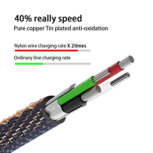 So Strong Enough tinned pure copper wire ensure rapid charging and oxidation resistance. Measured loop resistance less than 280mΩ. Measured voltage drop less than 0.6V when current is 2.4A. Pass 8000 times bending test: Bend angle 120°, load 1kg weight (Standard cable:1200 times).Premium high quality jean fabric braided. Extra durable and tangle-free and flexibility.