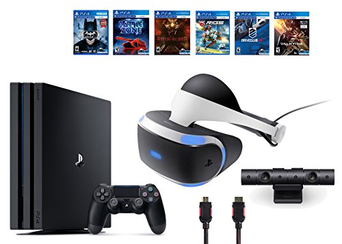 Includes: VR headset, Processor unit, VR headset connection cable, HDMI cable, USB cable, Stereo headphones, AC power cord, AC adaptor,PlayStation Camera,and PlayStation 4 Pro - 1TB and 6 VR Game disc:PSVR Until Dawn: Rush of Blood,PSVR EVE: Valkyrie,PSVR Battlezone,Batman: Arkham VR,PSVR DriveClub,RIGS Mechanized Combat League
