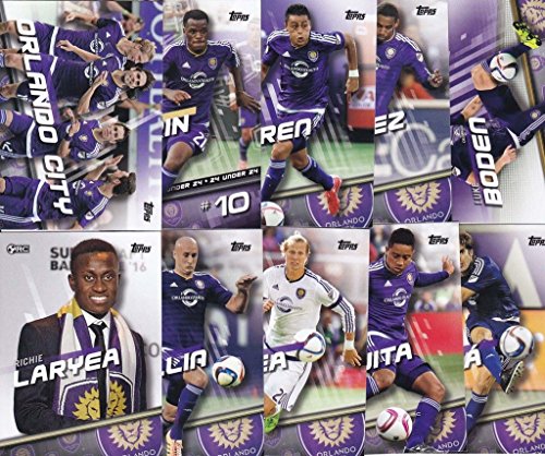 Orlando City SC 2016 Topps MLS Soccer Factory Sealed 10 Card Team Set Including Aurelien Collin, Brek Shea, Bryan Rochez, Cristian Higuita, Cyle Larin, Darwin Ceren, Kaká, Luke Boden, Richie Laryea's Rookie card and an Orlando City Team Card.