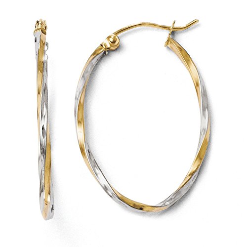 Traditional yet distinctive, these two-tone hollow hoops feature a polished twist design made from 10k yellow gold accented with white rhodium plating. They measures approximately 2mm in thickness, 21mm (13/16 inch) in width by 29mm (1 1/8 inch) in length and are finished with snap-down hinged posts that are comfortable and secure.Feature