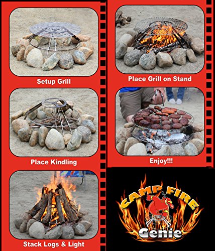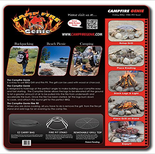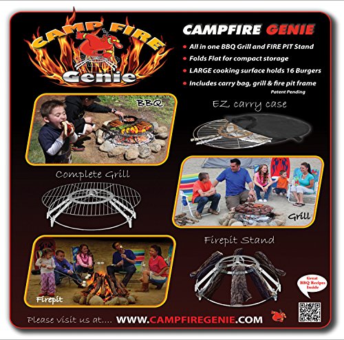 Studio : Campfire Genie Publisher : Campfire Genie Binding : Sports Product Description The Campfire Genie is an easy to use BBQ grill and Fire Pit. The grill can be used with wood or charcoal. It's designed to hold logs at the perfect angle to make building your campfire easy and fast starting. The Campfire Genei allows the logs to be elevated off the ground to let a greater amount of air to be pulled into the fire from underneath and accelerate the burn. Once the fire has been started let the logs burn down to coals and attach the round grill for the perfect BBQ. When you are done cooking, all you have to do is remove the grill from the fire pit stand and add logs for an evening by the camp fire. 0