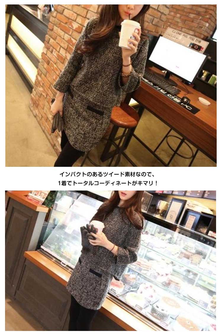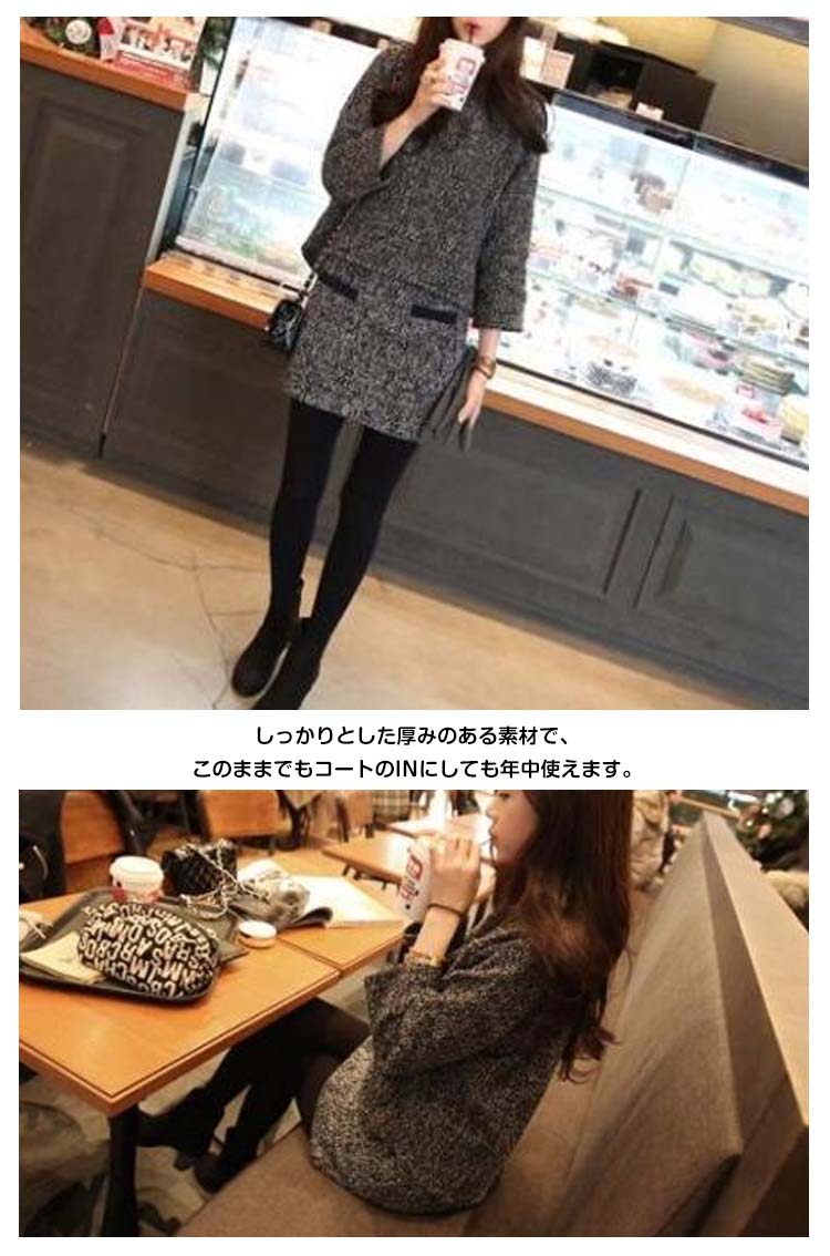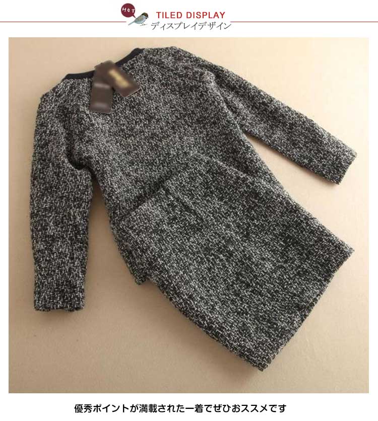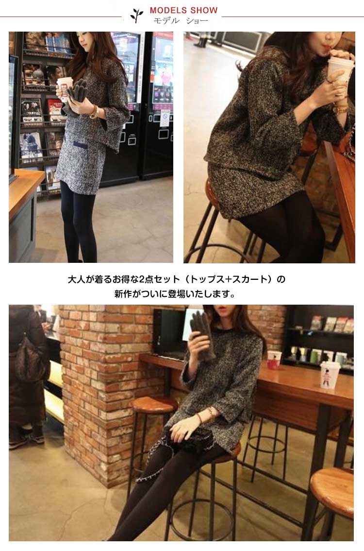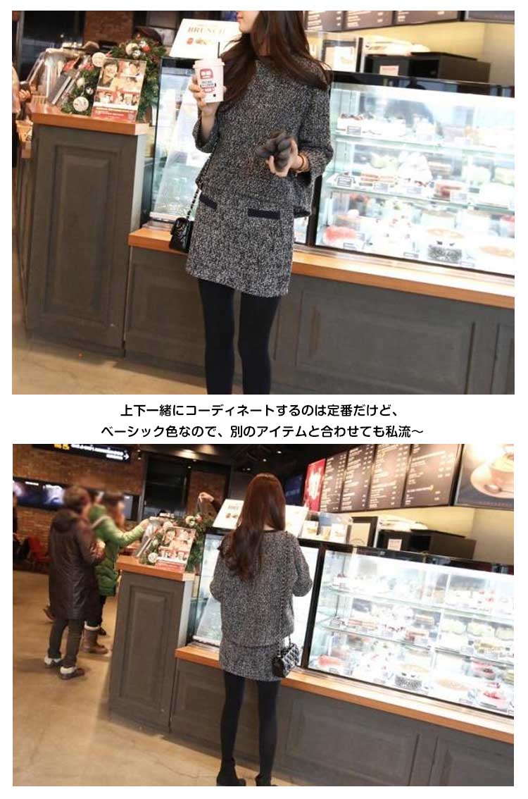 | 大人が着るお得な2点セット(トップス+スカート)の新作がついに登場いたします。インパクトのあるツイード素材なので、1着でトータルコーディネートがキマリ!しっかりとした厚みのある素材で、このままでもコートのINにしても年中使えます。上下一緒にコーディネートするのは定番だけど、ベーシック色なので、別のアイテムと合わせても私流?優秀ポイントが満載された一着でぜひおススメです! | |