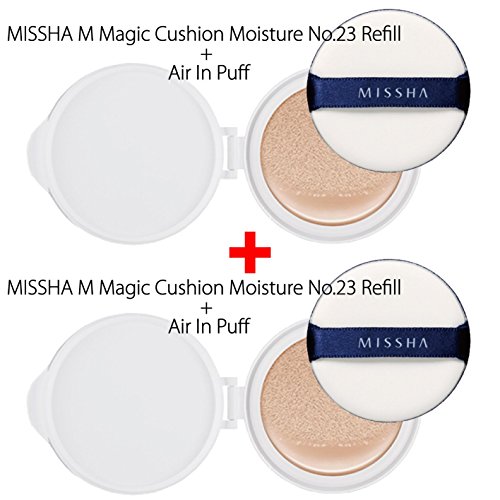 Feature : MISSHA M Magic Cushion Moisture 2 Refills (No.23) 2 Air In Puffs / ** MISSHA M Magic Cushion Moisture Refill (No.23) / * Flower water (lotus flower water, cornflower water and damask rose water) helps make moist and vitalized skin by tapping. * flower oil (evening primrose oil, safflower seed oil and sunflower seed oil) helps balance moisture / oil level of skin. * Photo-Well Bluming Powder helps correct skin tone to make it bright and lovely. / ** Air In Puff / This 3-layered puff helps you achieve an even makeup application. The middle layer sponge absorbs makeup content while the third layer helps makeup adhere to skin for better results.