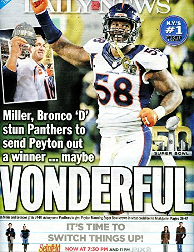 Denver Broncos Win Super 50 New York Daily News 2/5/2016- "Miller, Bronco 'D' stun Panthers to send Peyton out a winner...maybe WONDERFUL"