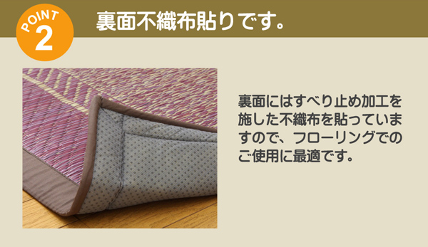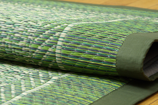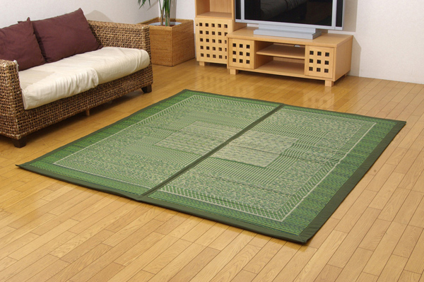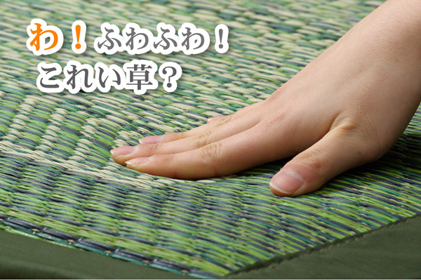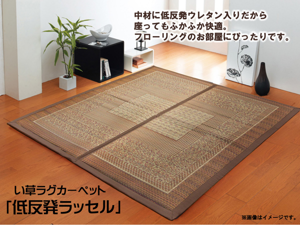 大型商品中材に低反発ウレタン15mmを使用したイ草カーペットです。低反発素材はエネルギーの吸収性に優れており、長時間使用した際の負担を分散します。裏には不織布を貼っていますので、フローリングのお部屋でのご使用に最適です。い草には空気の自然浄化作用、湿度の調節作用などがあります。また汚れにくく、使用するうちに黄金色に変化し、味が出ます。ホットカーペットカバーとしても使用できます。い草に青森ヒバ加工を施しています。(抗菌、防臭効果)