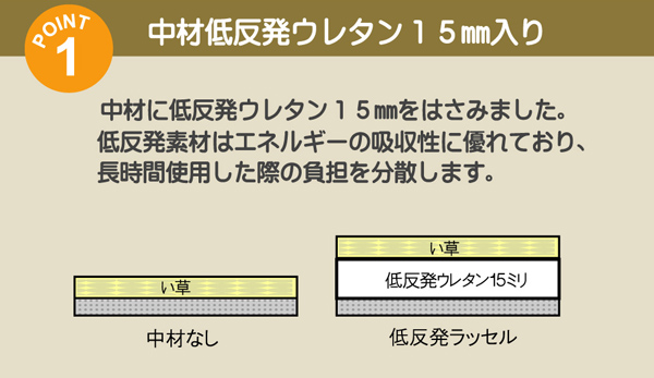 表地=い草 ※普通織 中材=低反発ウレタン15mm 裏地=不織布 ヘリ=綿100%