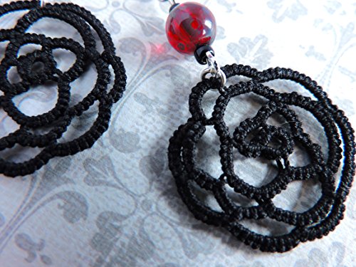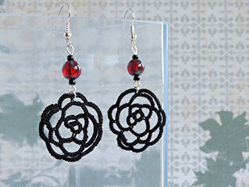 -. Title : Black Lace Rose Earrings with Czech Glass Ruby Picasso Beads - Silver Plated