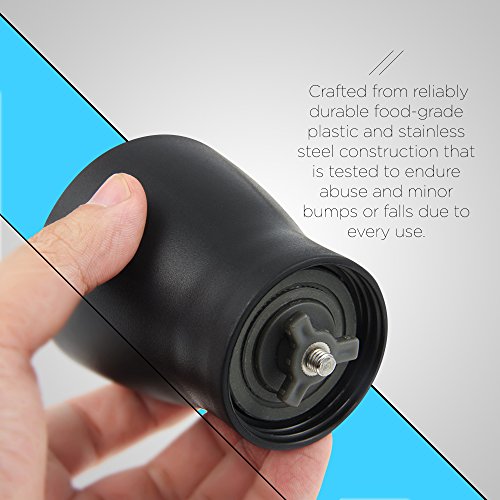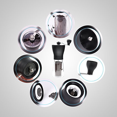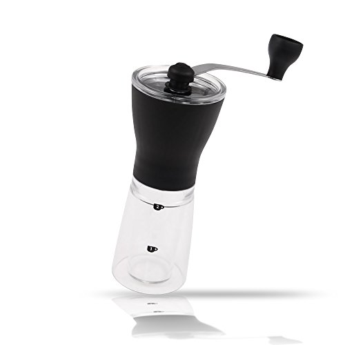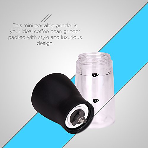 -. Feature : This mini portable grinder, measuring 8.3" x 3", is your ideal coffee bean grinder packed with style and luxurious design. It has a transparent double wall ground chamber allowing you to see how much coffee you already have grinded for the day. Quantity indicators are also visible on the wall chamber for ease measurement. / Crafted from reliably durable food-grade plastic and stainless steel construction that is tested to endure abuse and minor bumps or falls due to everyday use. It operates with an adjustable conical ceramic burr that is so convenient to set to preferred grind size. Guaranteed to repel corrosion, rusting, tarnishing and deformation and will last throughout the years to come. / Incredibly portable and compact making it your ideal coffee grinding gear for travelling, hiking, camping or whenever you are away from home. It's slender and sleek design allows you to easily fit this into your travelling bag. It's a perfect grinding tool for today's modern kitchen, it helps you save your precious space without compromising efficiency in making one nice coffee. / Hassle-free clean-up. Definitely easy to disassemble for a thorough clean-up. It's grind collecting jar is entirely dishwasher safe while the grinding compartment that in-houses the grinding burrs can be cleaned using your coffee tool brush to remove any ground gunk. / Order this today by adding this special coffee grinder in your shopping cart. This is your perfect solution for those homes or trips where only minimal amount of grinding is needed. A great gift idea to those loved ones who loves making their own coffee as much as they love to travel. It produces a consistent grind for brewing a perfectly smooth coffee. Grab yours now!